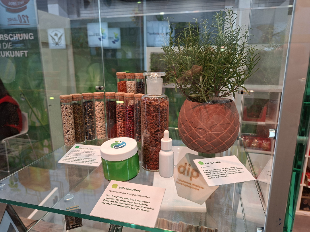 Bundesforschungsministerin Dorothee Bär wurde am DiP-Stand von den Leitungen der DiP-Partnerhochschulen empfangen: MLU-Rektorin Prof. Dr. Claudia Becker und Hochschulpräsident Prof. Dr. Jörg Bagdahn (Hochschule Anhalt). Sie informierte sich über die vielfältigen F&E-Ansätze in den DiP-Verbundprojekten. Besonderes Interesse galt den Projekten aus dem Leuchtturm „Neue Wertschöpfungsketten der Sonderkulturen“: DiP-Tres2Cera zeigte, wie aus Apfeltrester hochwertige Ceramide für Hautschutzprodukte und Impfstoff-Adjuvantien gewonnen werden. DiP-NA-WIR präsentierte den Anbau klimaresilienter Heilpflanzen wie Rosmarin, Salbei und Chinesischer Buschnessel sowie deren Verarbeitung durch KI-gestützte Verfahren und biotechnologische Veredelung.