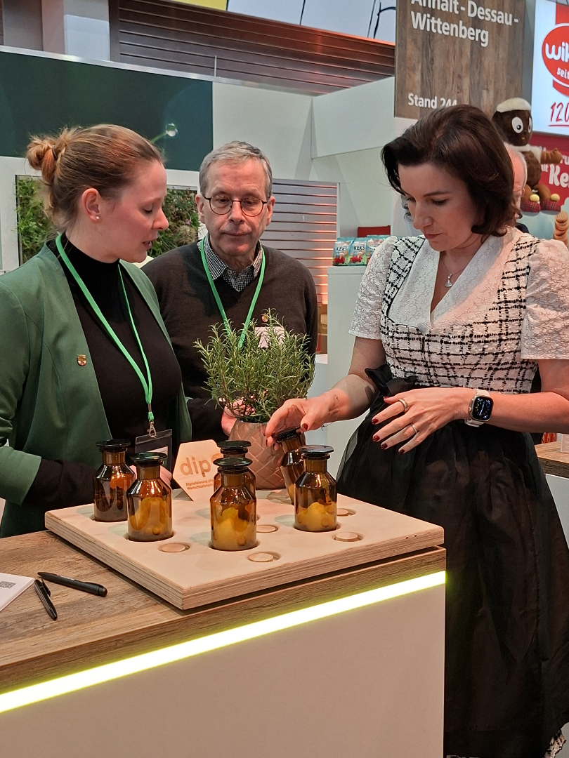 Der Erfolg der DiP-Präsenz auf der Grünen Woche wäre ohne die hervorragende Zusammenarbeit am Gemeinschaftsstand der Hochschulen Sachsen-Anhalts „Forschung für die Zukunft“ nicht möglich gewesen. Unser besonderer Dank gilt Prof. Dr. Elena Kashtanova und Simone Keim (Hochschule Anhalt) für die exzellente Vorbereitung und Gesamtorganisation sowie für die herzliche Aufnahme. Der Gemeinschaftsstand war durch ein echtes Miteinander udn gegenseitigen Austausch geprägt – wir freuen uns schon auf die nächste gemeinsame Präsenz!