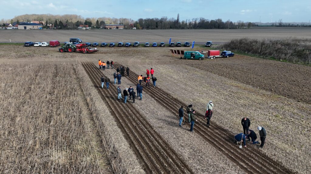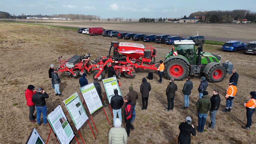 Anlässlich der diesjährigen Aussaat fanden Ende März zwei Feldbegehungen in Sachsen-Anhalt statt. Vor Ort wurden das Verfahren und die eingesetzte Technik demonstriert sowie erste Erfahrungen aus dem Projekt vorgestellt. Ergänzt wurde das Programm durch fachliche Einordnungen, unter anderem zum Pflanzenschutz.